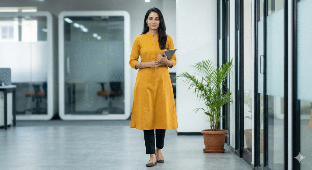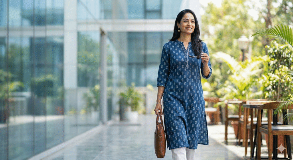 Ditch the stiff shirts. Opt for our crisp A-line cotton kurtis in solid colors or subtle block prints. Pair them with cigarette pants or ankle-length leggings. It’s a look that says, “I mean business,” but feels like pajamas.